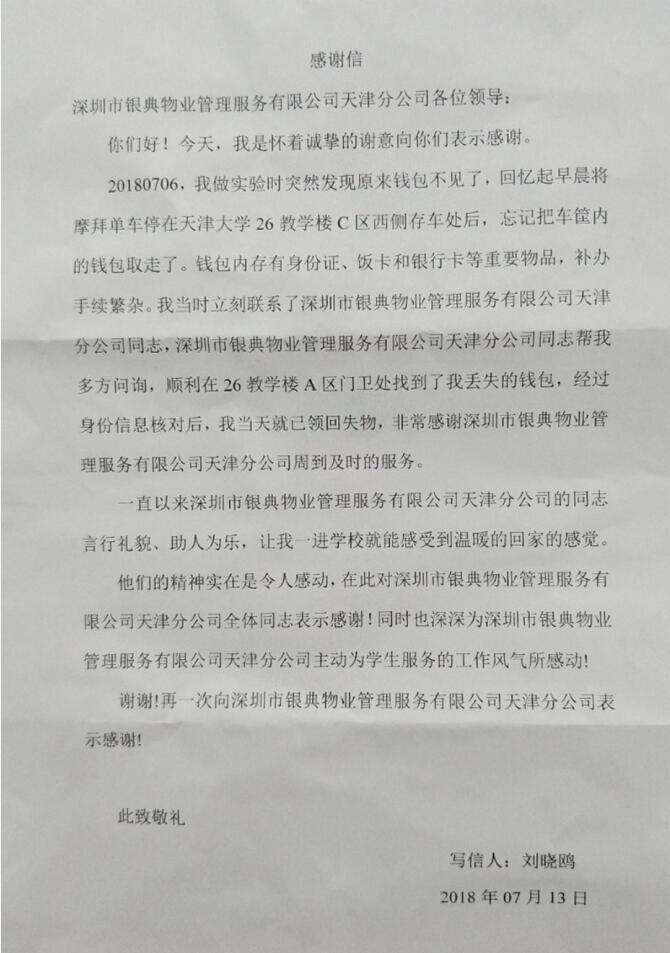 該名學(xué)生在核實身份后,順利取得錢包,且檢查重要證件未被遺失。由此為對我司工作人員的樂于助人、工作細致、服務(wù)周到的品質(zhì)表示由衷的感謝,特贈予我處錦旗一面,感謝信一封。(詳見附圖)