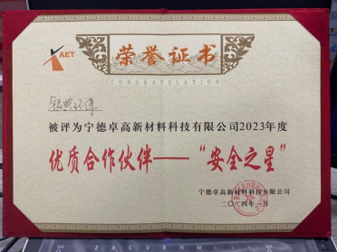 寧德銀典環(huán)保工程公司,在2024年1月29日這個(gè)值得紀(jì)念的日子里,榮獲了寧德卓高新材料科技有限公司頒發(fā)的“2023年度優(yōu)質(zhì)合伙人”稱號,并被授予《安全之星》榮譽(yù)。這不僅是對我們12年來在環(huán)保設(shè)施運(yùn)維服務(wù)領(lǐng)域深耕不懈的肯定,也是對我們團(tuán)隊(duì)高度安全意識和專業(yè)管理能力的認(rèn)可。
